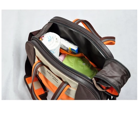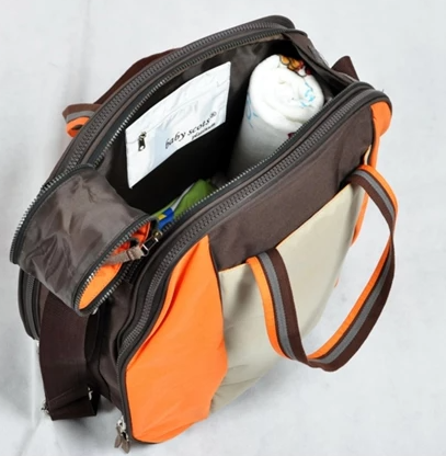 Pada bagian depan tas, terdapat kantung yang dapat disisipkan untuk menaruh saputangan bayi, tissue basah atau yang lainnya
